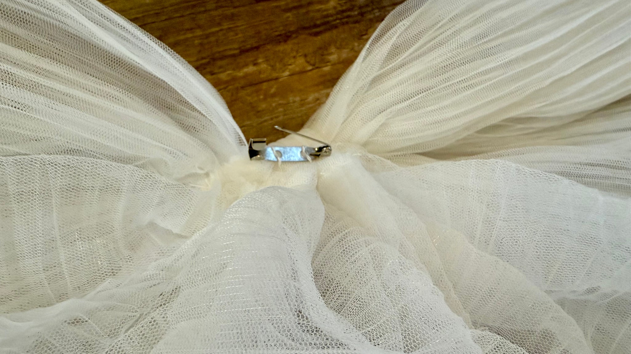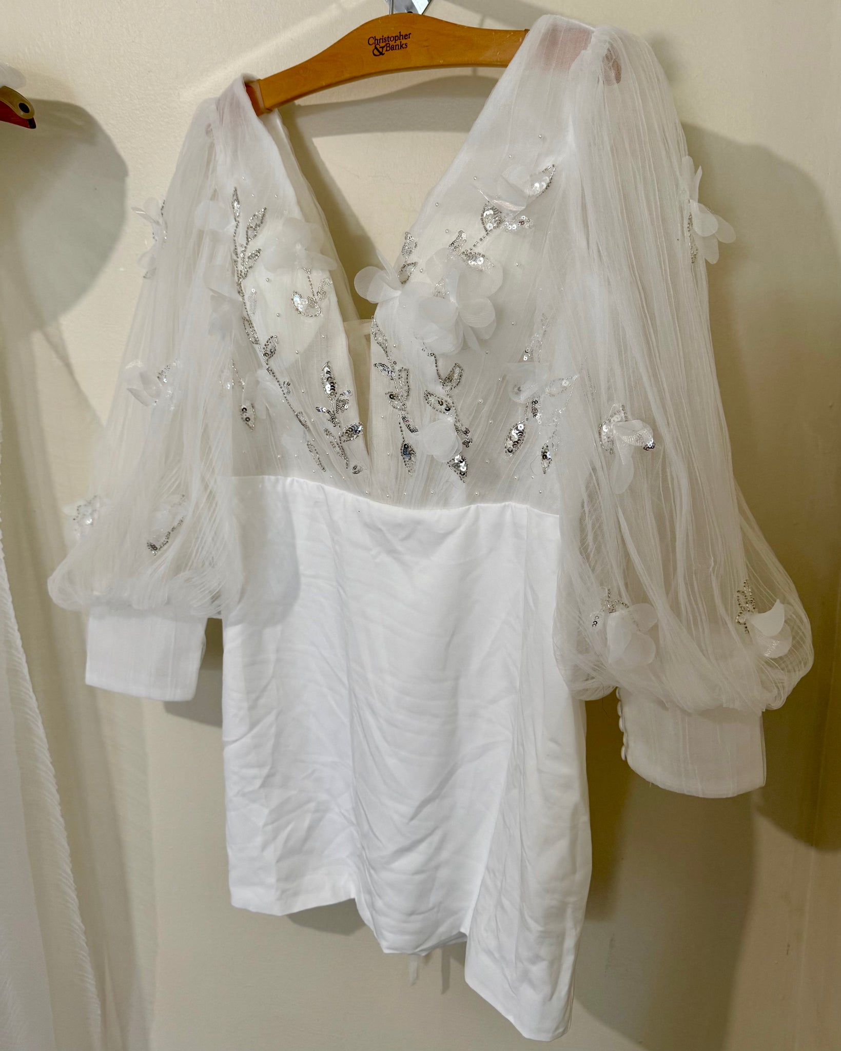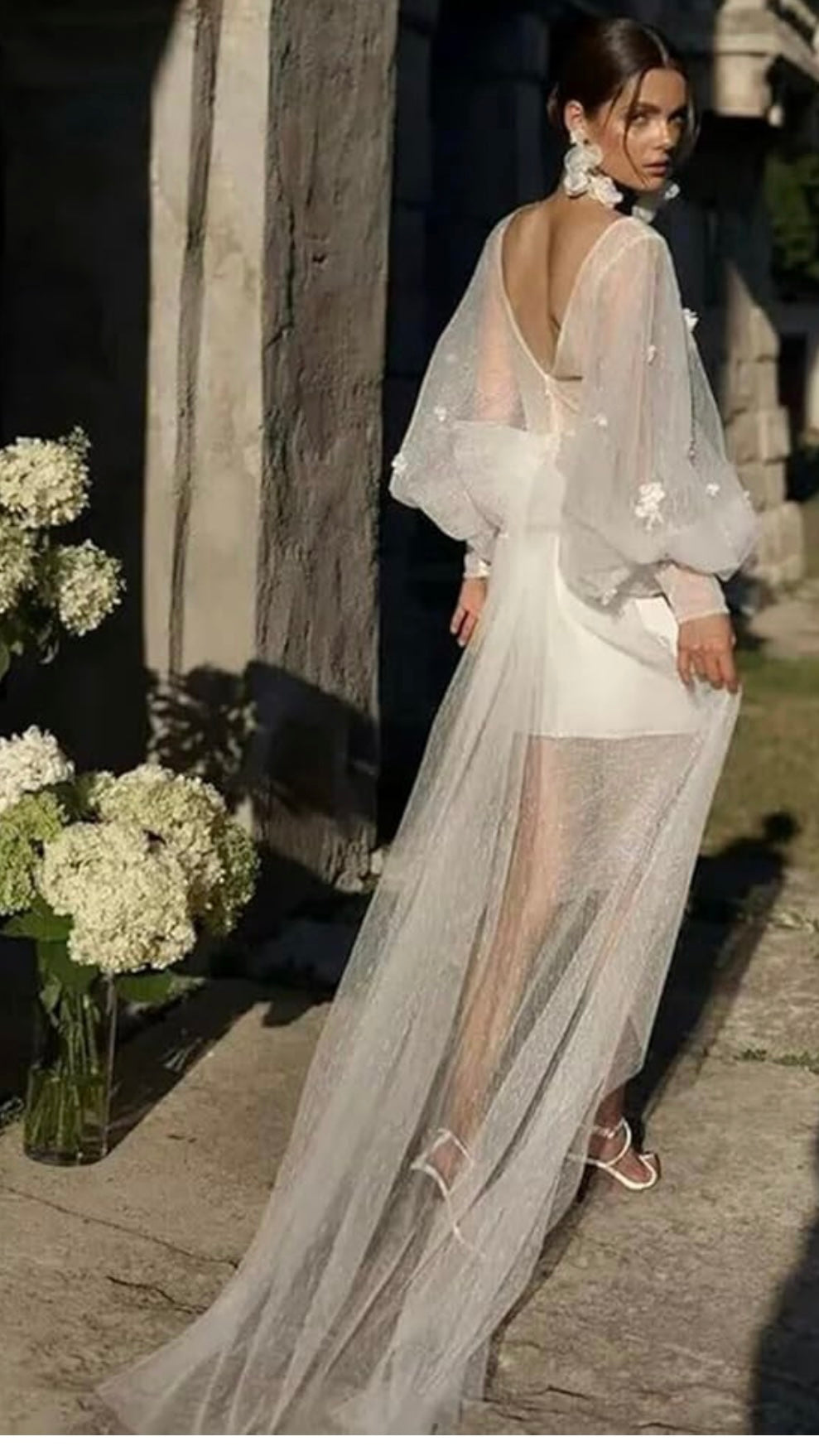 detachable chiffon bow for train or hair piece. Floral appliqué on sleeves, plunge neck line, corset back.