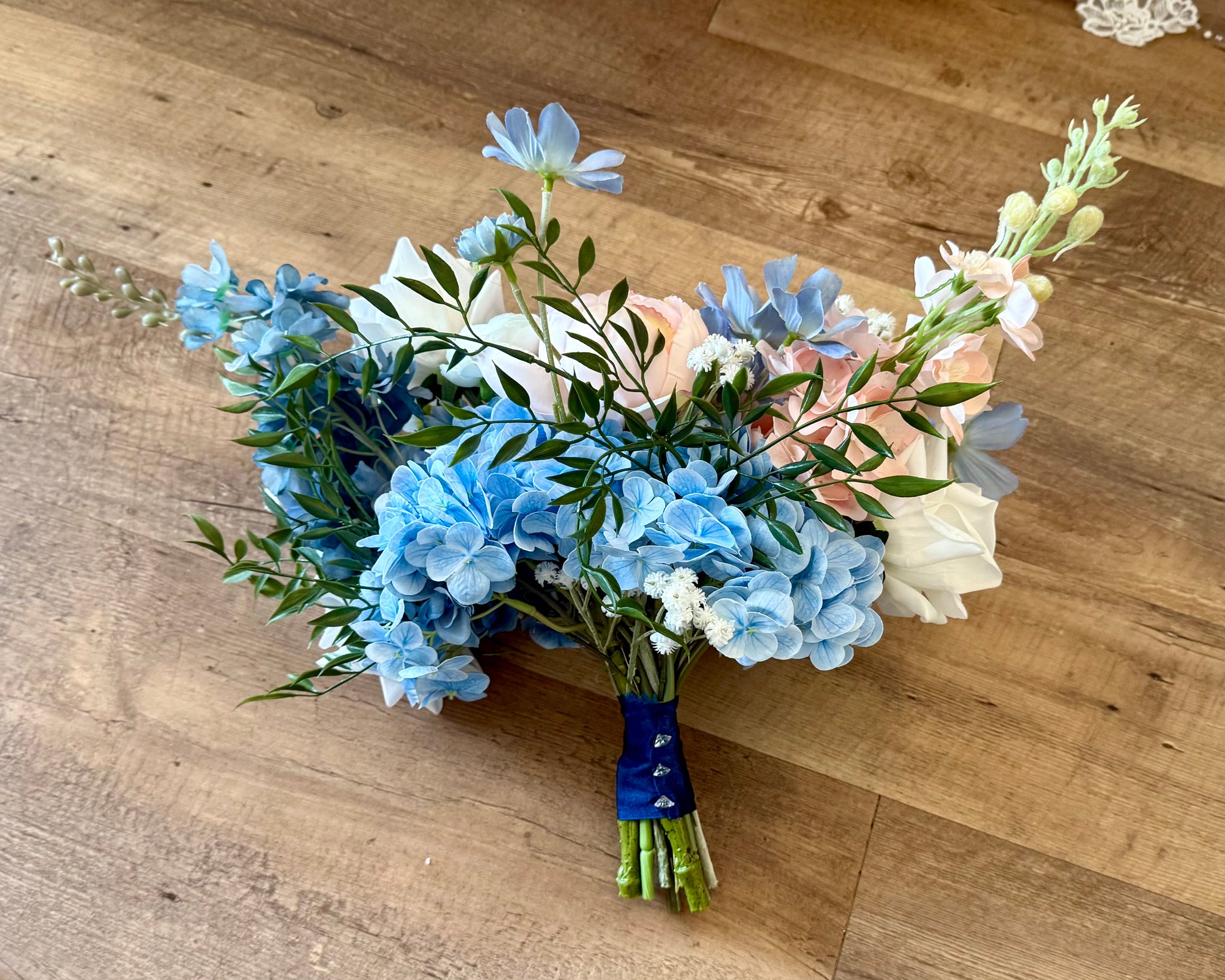 Set of 4 real touch, matching pinks and blues. 3 bridesmaid & 1 MOH/Bridal bouquet