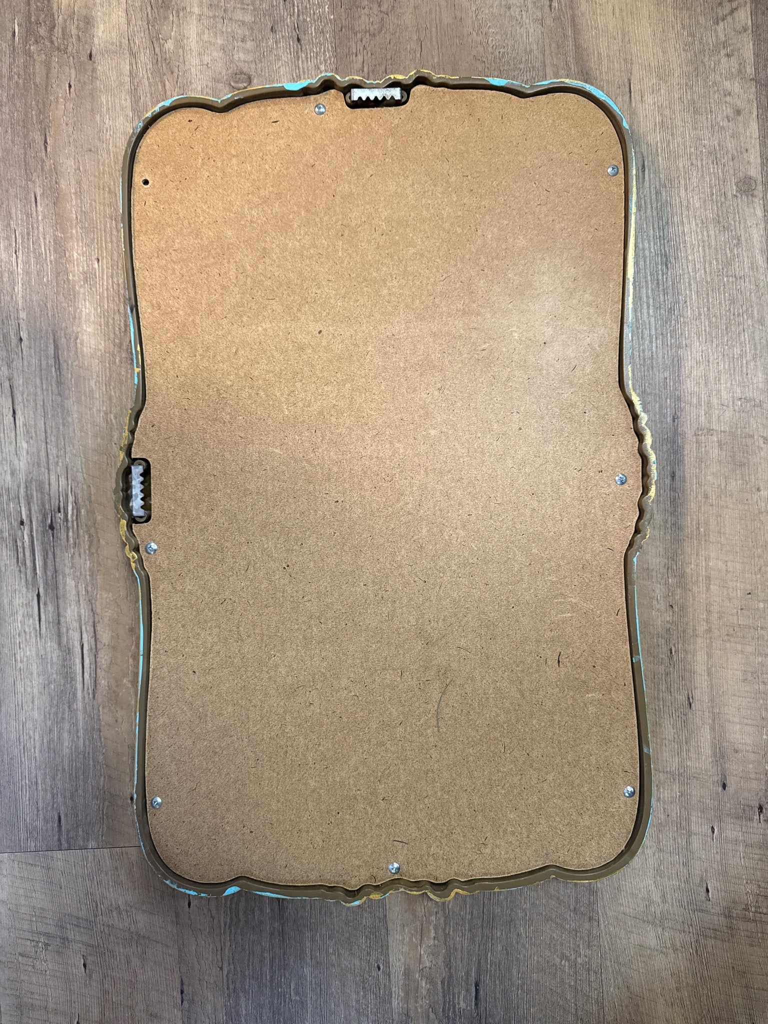 CANNOT SHIP. Originally a mirror painted black with gold trim, vinyl lettering. Approximately 22” x 15”