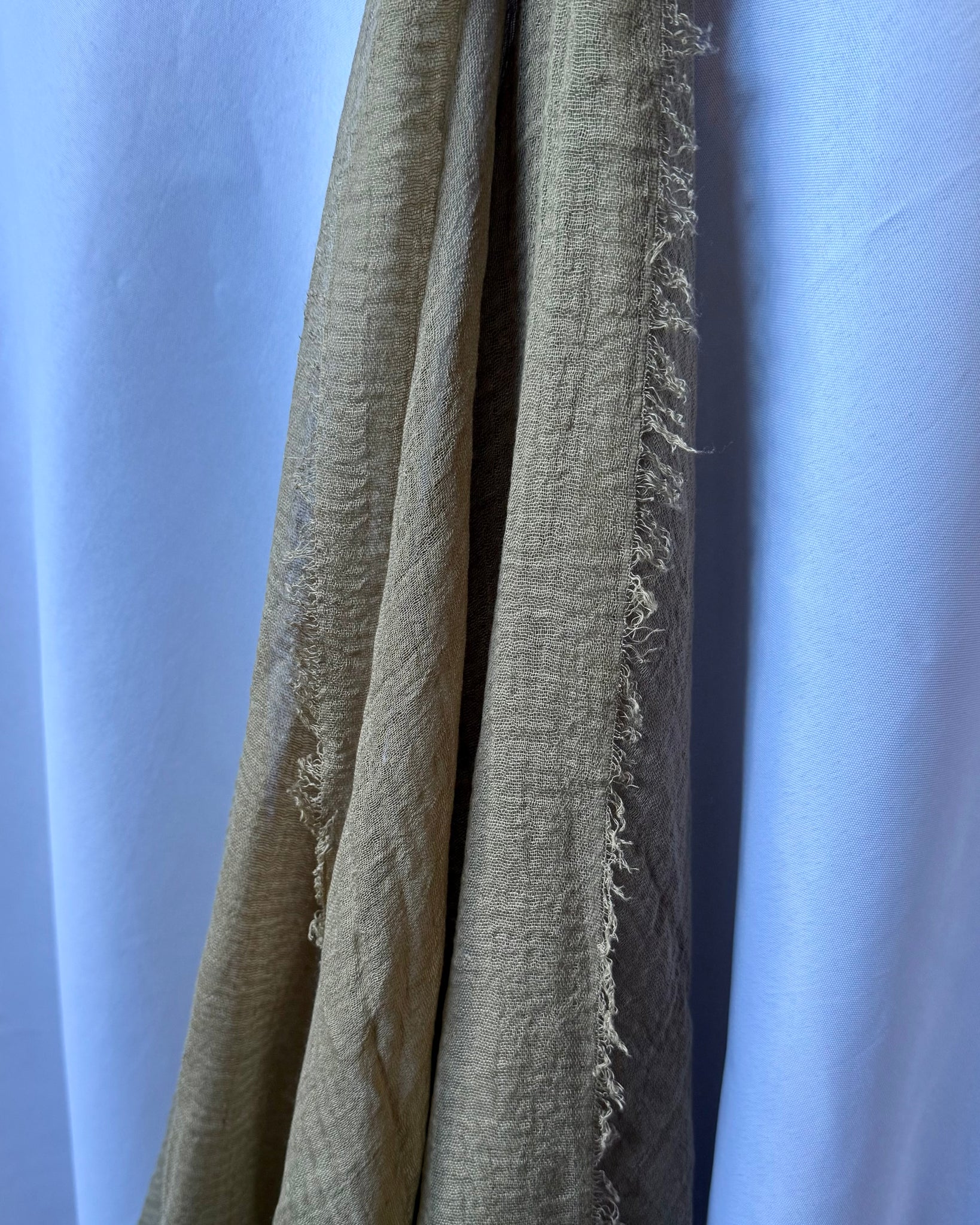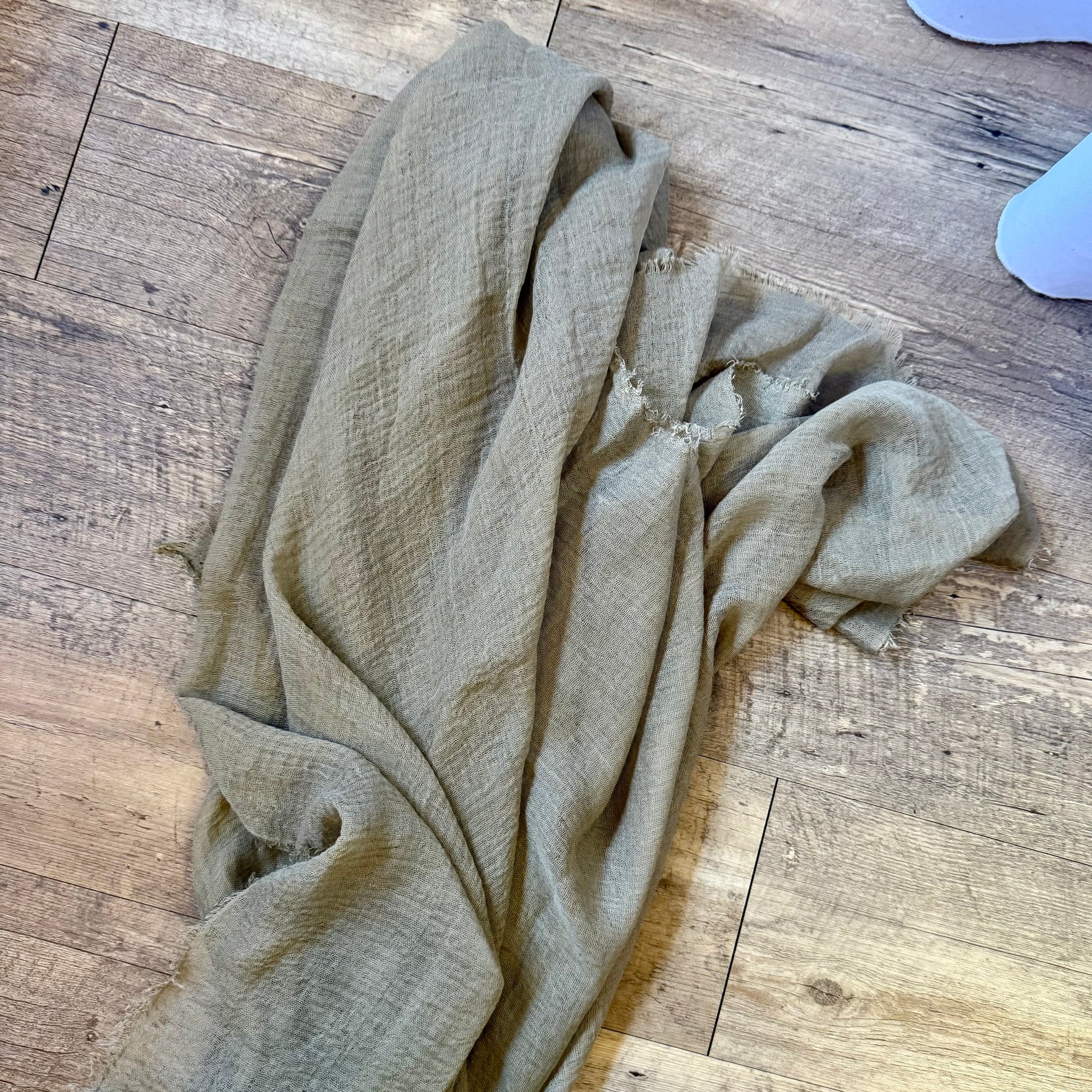 New olive/tan brown table runner or draping material, approximately 7 ft x 3 ft. cheesecloth material